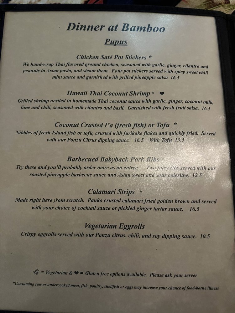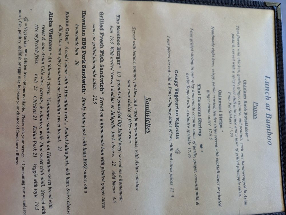 The menu showcases a rich variety of dishes, from the Chicken Sate Pot Stickers to the refreshing Bamboo Salad, crafted with organic greens and seasonal Hawaiian delights. Don’t miss the famous Grilled Fresh Fish Sandwich, featuring herb-basted fish that transports your taste buds to the islands.