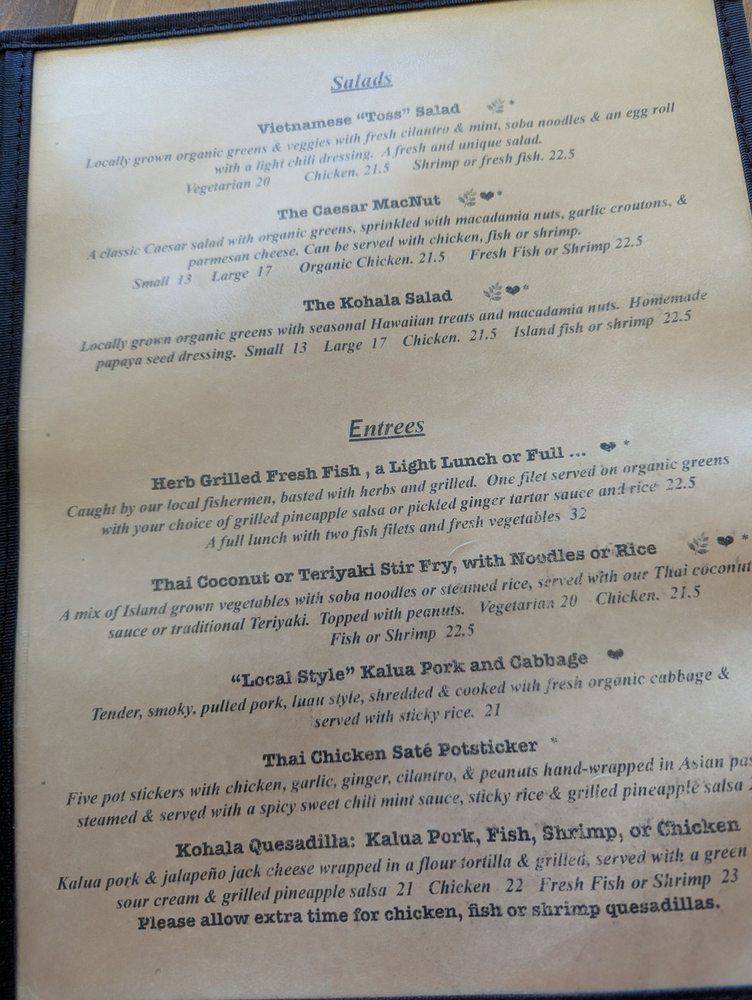 A blend of organic kohala grown greens garnished with fresh seasonal hawaiian treats and roasted macadamia nuts.large Or small with fresh island fish or shrimp if you'd like