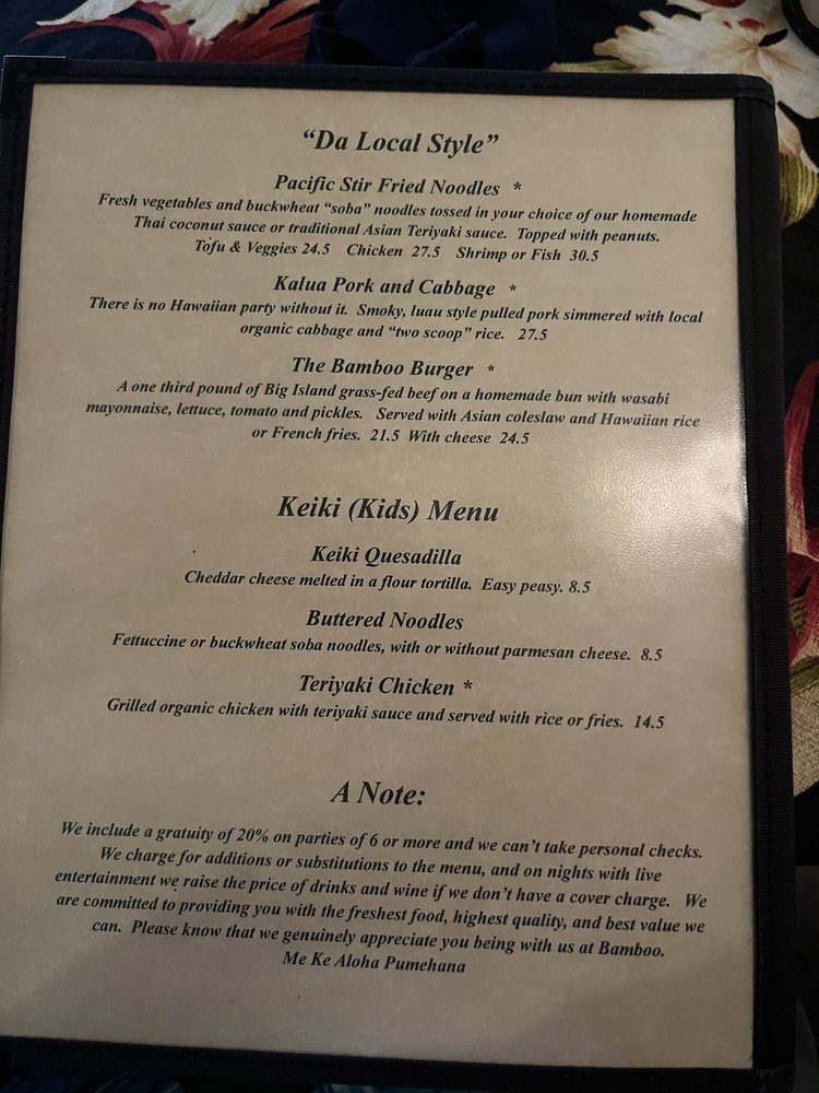 Welcome to Bamboo Restaurant & Gallery, a vibrant corner of Hawaiian cuisine located at 55-3415 Akoni Pule Hwy, Hawi, HI. This charming eatery not only offers a delightful menu but also welcomes you with its casual atmosphere, making it an ideal spot for groups, families, and even pets.